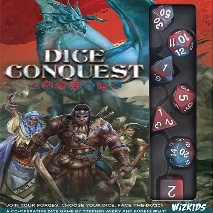 Dice Conquest is designed by Stephen Avery and Eugene Bryant, and features illustrations by Mirco Paganessi. It includes a beautiful set of 7 polyhedral dice, but players are also free to swap in their favorite set of dice instead!
