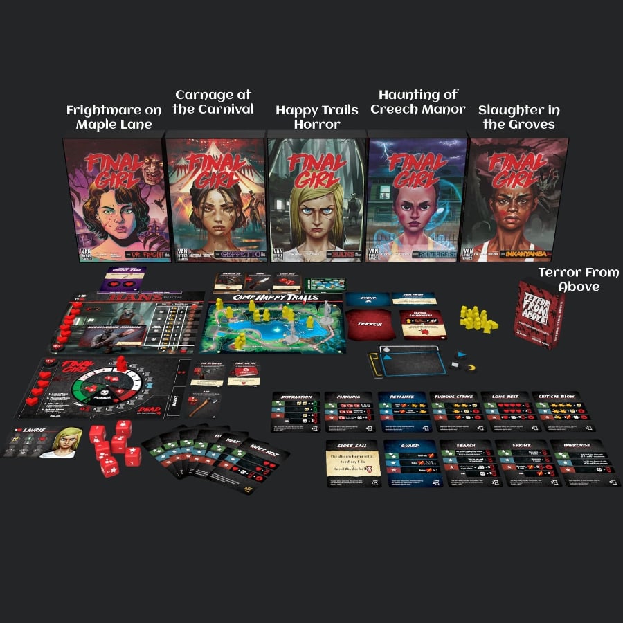 Playing on a famous horror movie trope, Final Girl is a solitaire-only game that puts the player in the shoes of a female protagonist who must kill the slasher if she wants to survive.