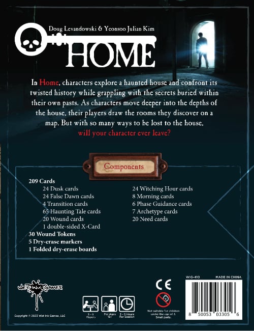 In HOME, you’ll be taking on the role of someone exploring a house. On your turn, you’ll draw a card, answer a question on the card without revealing the card to your fellow players, and shape the story of your night in the house. As you go, you’ll work to meet your needs, but you’ll also sustain wounds. At the end of the night, you’ll find out if you make it out of the house alive. Explore carefully, as if you can control that.