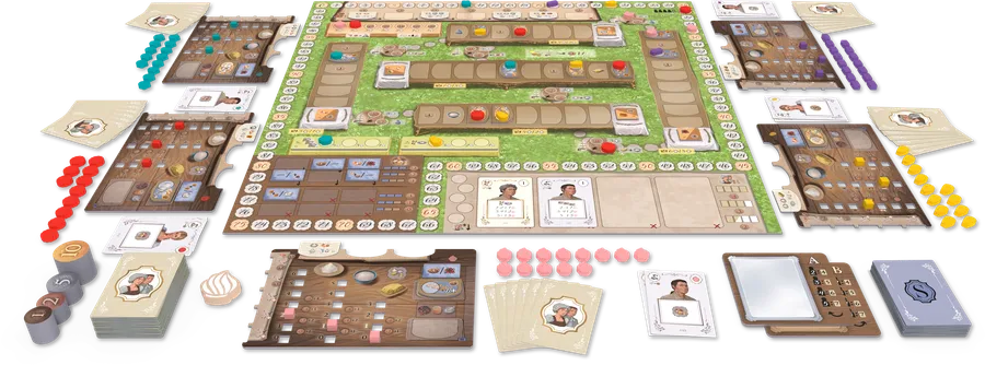 In La Pâtisserie Rococo, players represent the pastry shops (les pâtisseries) and pastry chefs (les pâtissiers) that are preparing pastries for sale and for show at the Versailles Garden Festival. Using the unique deck-building mechanism from Rococo, players hire staff to create recipes, acquire quality ingredients, and bake delicious desserts. Then comes the challenging decision of whether to sell these delectable creations for profit or present them for possible awards. The player who creates the most acclaimed desserts will gain fame and the respect of the king and his nobles.