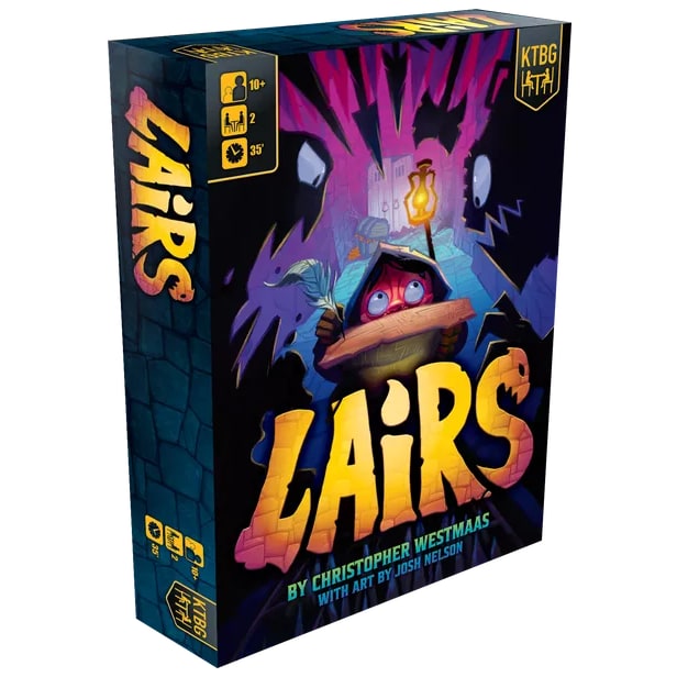 Lairs is a two-player game for ages 10 and up that plays in about 35 minutes. The players create a challenging catacomb for their opponent to explore while at the same time attempting to navigate their opponent’s dungeon using guile, deduction, and a little bit of luck.