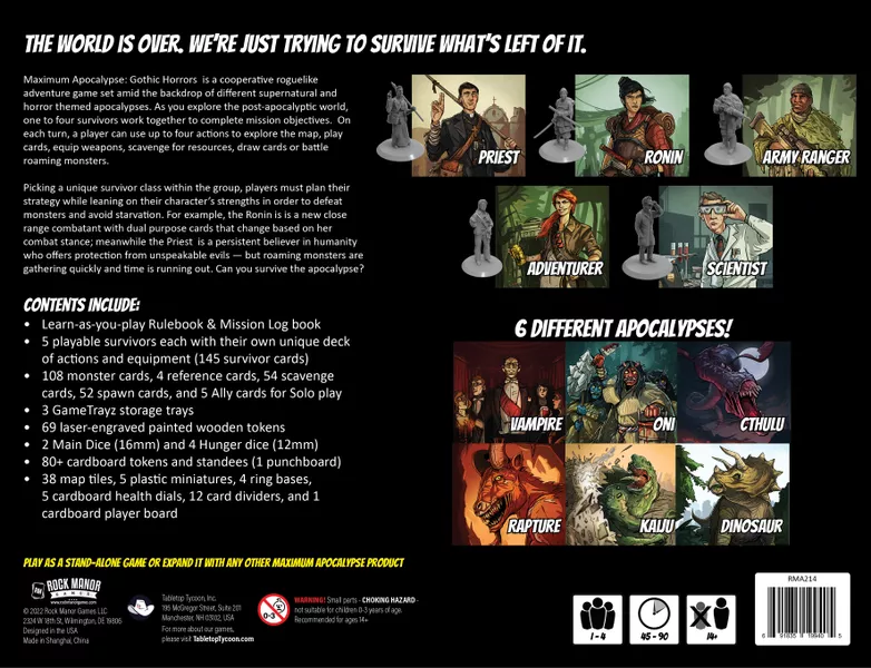 Maximum Apocalypse: Gothic Horrors 2nd Edition is a revised standalone game that collects several smaller Maximum Apocalypse expansions — Gothic Horrors, Kaiju Rising, Jurassic Perils, and Allies of the Rapture — in one box that contains six apocalyptic scenarios: Cthulhu, Kaiju, Dinosaurs, Vampires, Yokai, and the Rapture.