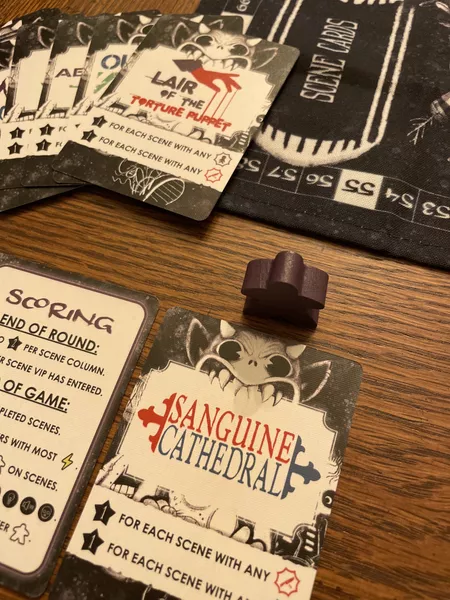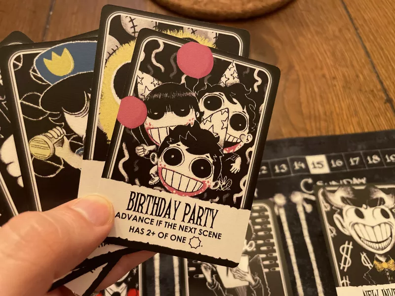 On a turn, draft two cards from a hand to use in your layout, building the experience from left to right. Either add new rooms, or ‘scenes’, that bolster your theme, or merge them together to bolster previous ones with the use of add-ons like costumes, special effects, and decor. Use your staff to finish your creation, or to rearrange your haunt and perfect the crescendo of fear. Keep in mind your theme, the needs of your scenes, and the VIPs that will visit on the first, second, or third rounds of Opening Weekend, with each randomly seeking different elements to approve of.