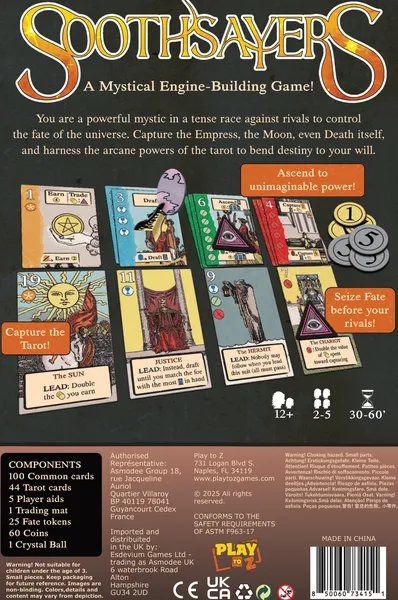 On your turn, choose an action: earn coins, draft cards, ascend to higher levels, or capture a tarot card. Rival soothsayers may choose to follow your action, but if you have a higher level, they must pay you for the privilege.